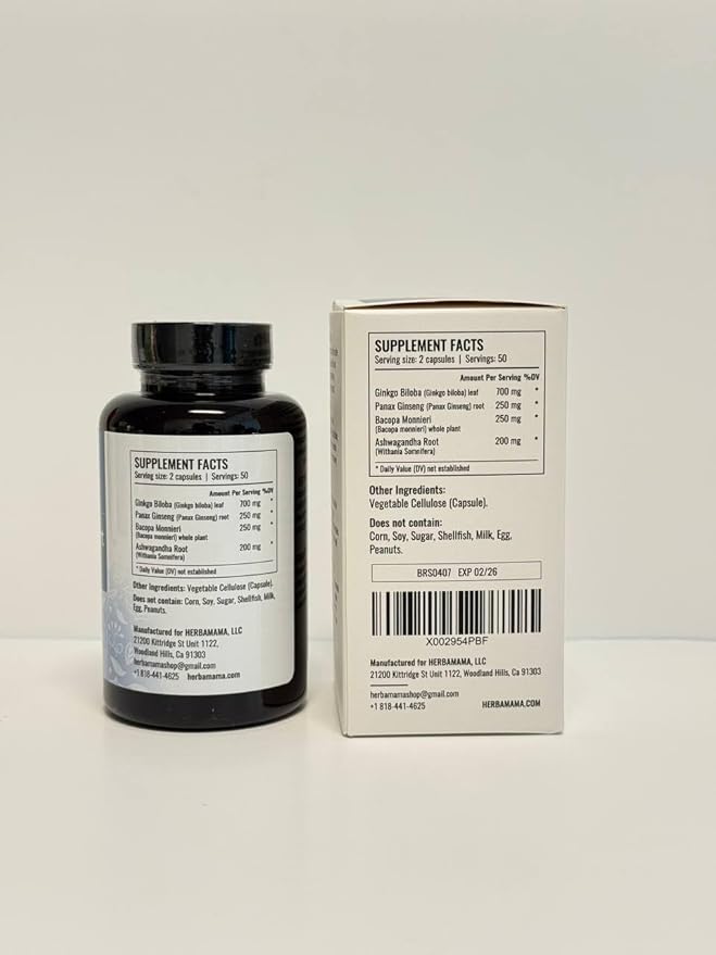 - Brain Support: Herbamama’s Brain Support capsules are carefully crafted to support focus and clarity. This Bacopa, Panax ginseng, Ashwagandha, and Ginkgo Biloba herbal complex provides antioxidants to promote brain support and calmness.