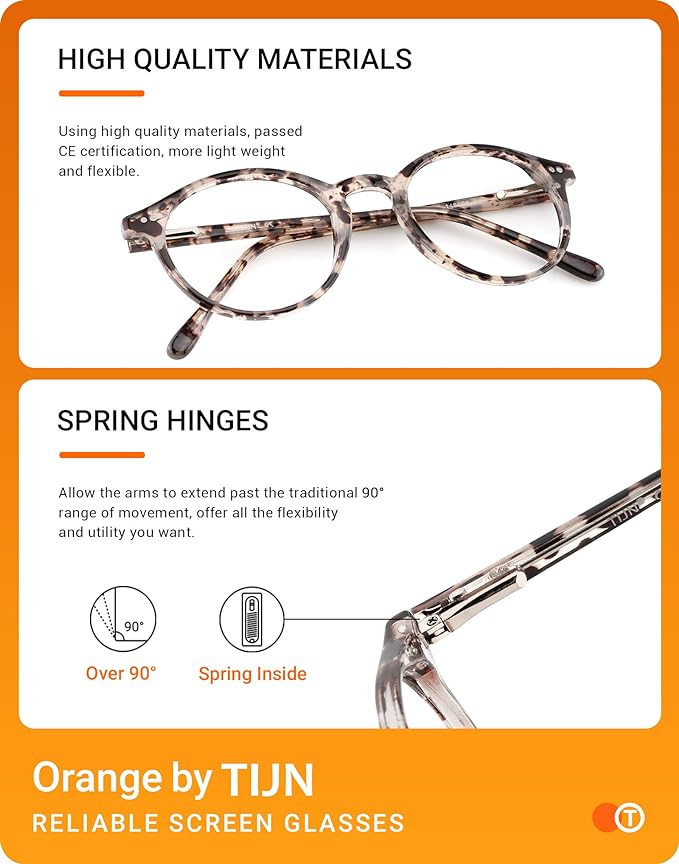 - Premium Materials; High-quality acetate materials are used in these non-prescription glasses; TIJN circle blue light glasses passed the CE certification, lightweight and durable; Other more, there are flexible spring hinges are used in our glasses frame, which allows the arms to extend over the traditional 90°range of movement, offers all the flexible and utility you want