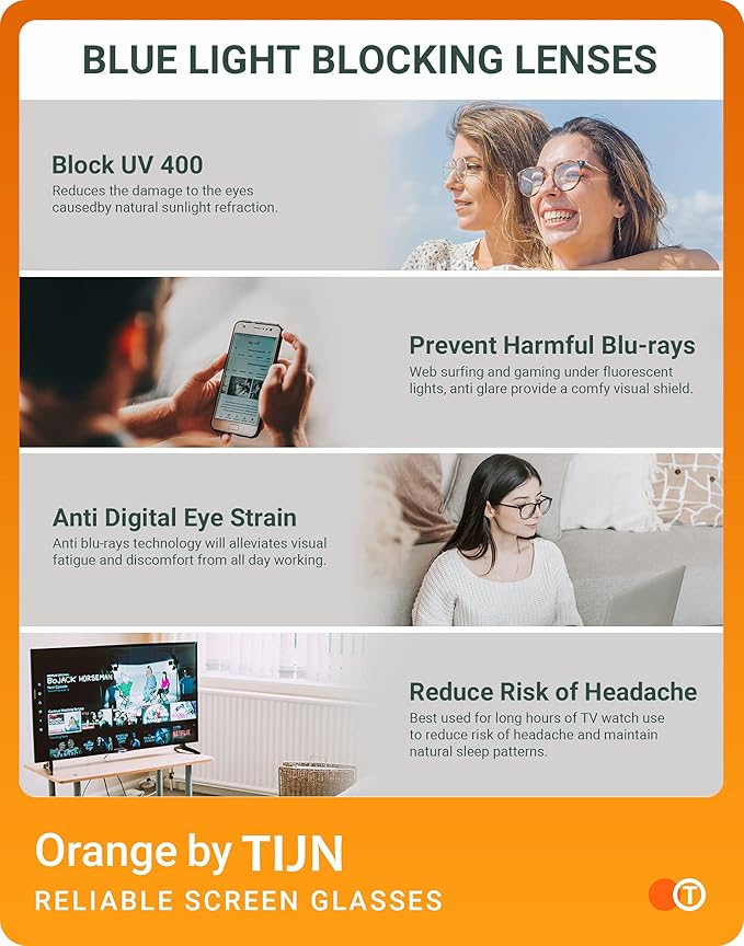- Blue Light Blocking; TIJN blue light blocking glasses for women/men/teen blocks harmful blue ray effectively; Whether working on the computer, using a smartphone, or watching TV, we spend long hours looking at a digital screen, many people have experienced digital eye strain symptoms such as dry eyes, headaches, blurry vision, and eye fatigue; These Fashion glasses anti harmful blue light, 100%UV, screen flicker, provide all-day protection, without getting that harsh yellow found in otherglasses