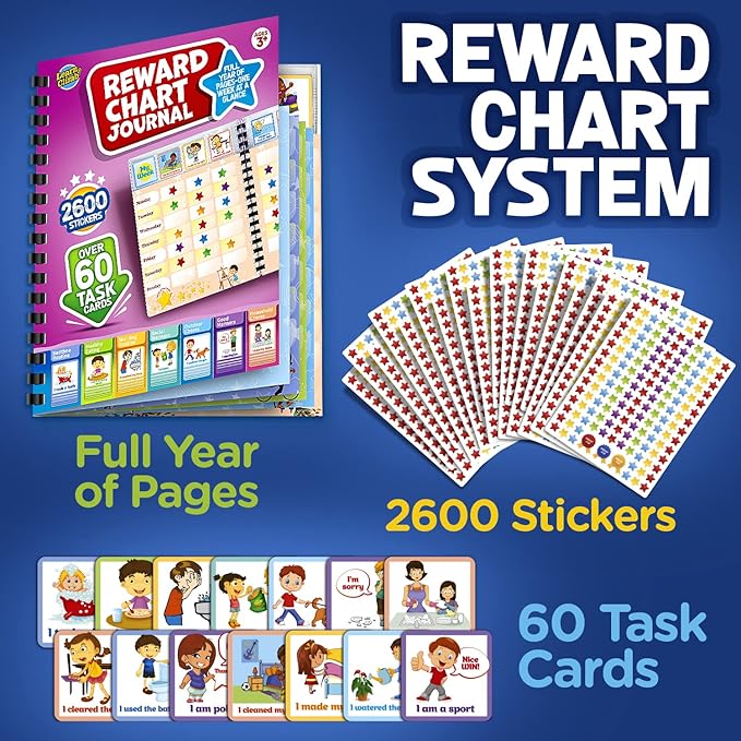 - WEEKLY BREAKDOWNS - This Reward chart book includes weekly reward charts, and stickers to last all year ( + bonus motivational stickers !!!). 60 task cards are included, so you and your child can customize their book to display the 7 tasks applicable to your lifestyle and needs. The tasks cards can be switched around, so that you can introduce new tasks as needed. It also includes a convenient card storage system to keep the task cards from getting lost!