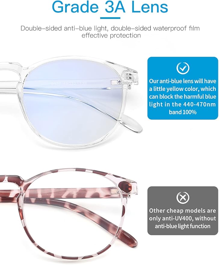 - [Double-sided Blue light filter lens] No worry about eye fatigue, blurred vision and headache.Because the glasses block the most harmful blue light from computers,tablets, games, on the phone or on TV