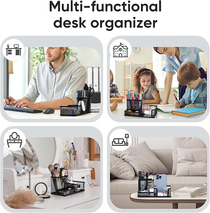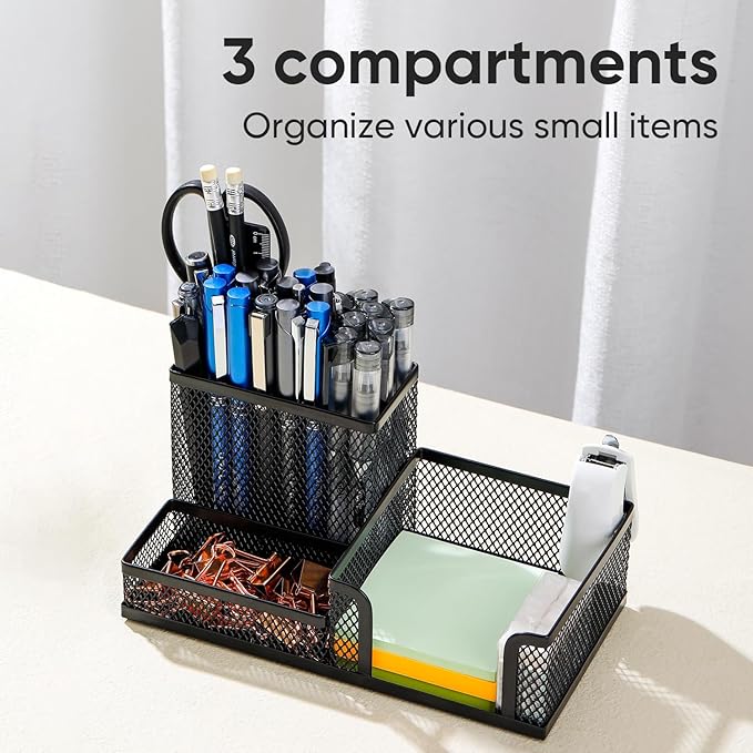 deli Mesh Desk Organizer Office Supplies Caddy with Pencil Holder and Storage Baskets for Desktop Accessories, 3 Compartments, Black