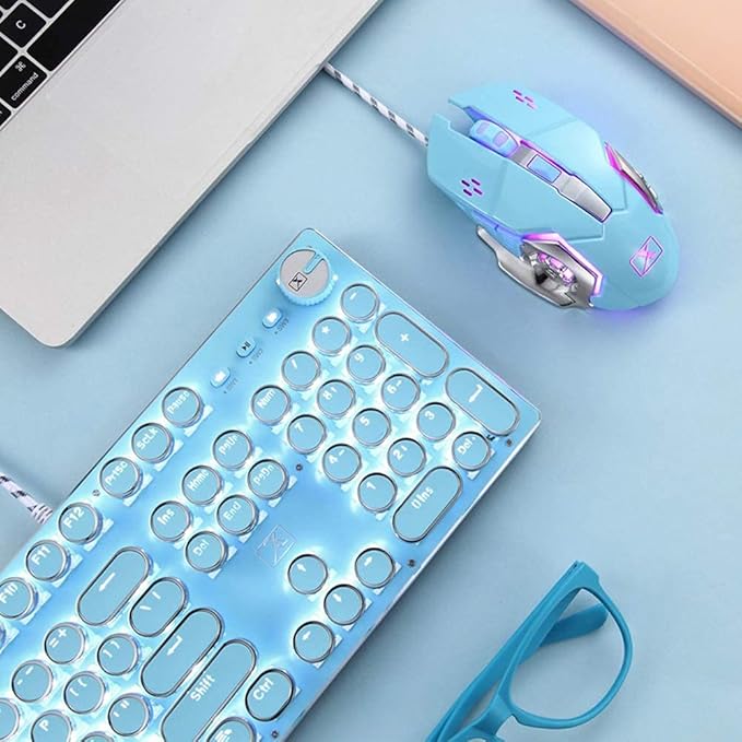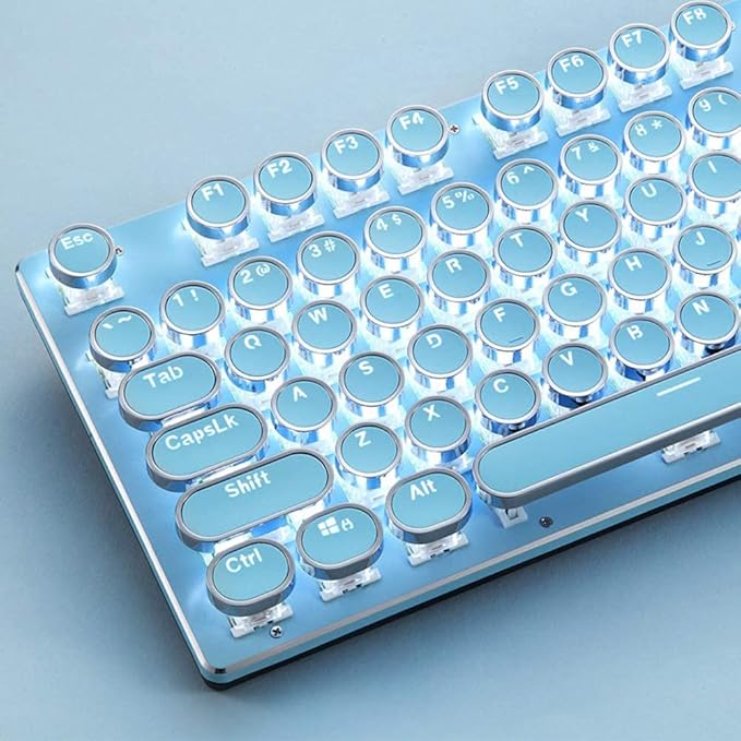 - 【Mechanical Blue Switch Gaming Keyboard】 - Mechanical Blue Switch Gaming Keyboard (Cherry Blue Equivalent) for ultimate gaming performance. Retro keycap looks like a classical typewriter, brings you comfortable typing feeling & stable clicking touch. The Mechanical Keyboard Keys offer medium resistance, audible Click Sound & Tactile Feedback. Sensitive and Responsive. Easy to press and fast response.