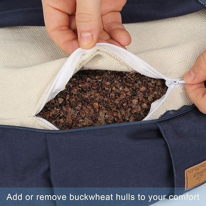 - CONVENIENT. Each zafu meditation cushion has sturdy carry handle for easy transport. The enough buckwheat hulls filling can be added or removed from zipper access to find the optimal level for your body. Organic cotton cover of Yoga bolster can be machine washed with cold water to reduce the risk of shrink or fade.