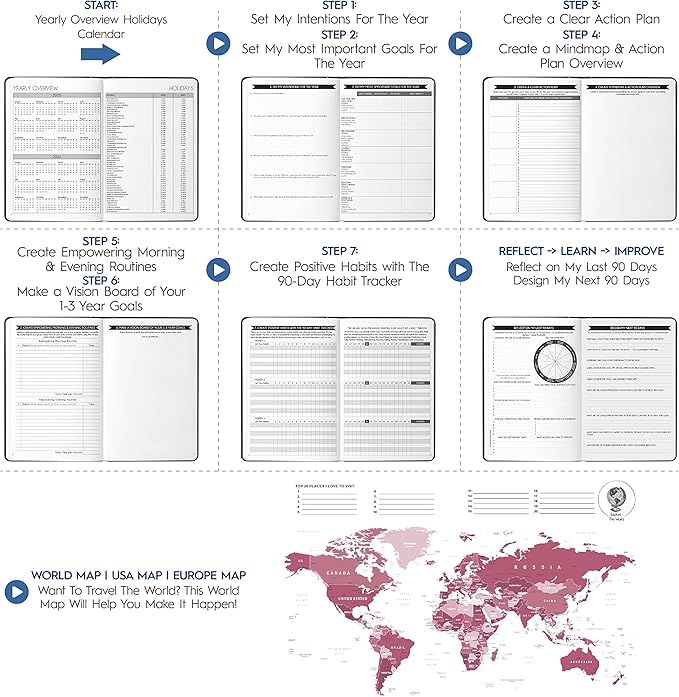 - LUXURIOUS + TOP QUALITY - Beautiful durable soft cover made from animal-friendly PU leather. Ideal for both women and men, perfect for entrepreneurs, professionals, college students and everyone who has burning desire to turn dreams into reality! FREE VIDEO MINI-COURSE: You will learn 10-min morning routine used by the most successful people to 10-fold your productivity, focus, happiness & passion! You will master setting goals & fix procrastination!