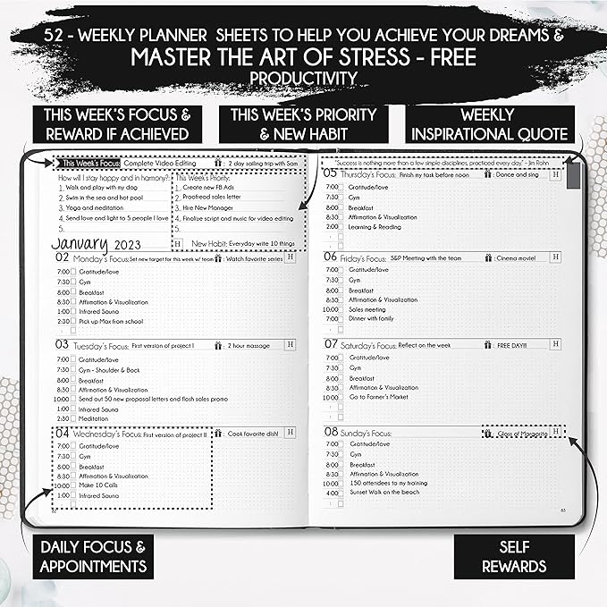 - LIFE PLANNER - All the success tools you need to create the life you always wanted - A5 Size (5.8 x 8.3 inch) with 196 pages of life transformation, 52 weekly, 12 monthly planning overviews & reflection, 24 journal pages, habit trackers, mind maps, out foldable vision board, morning & evening routines