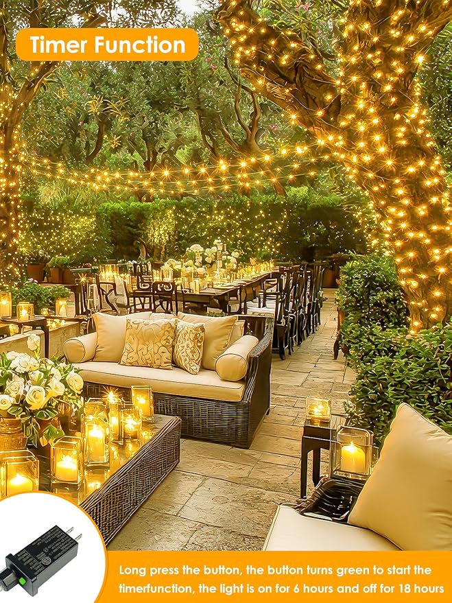 - Convenient Timer Function & 8 Modes & Memory Function: The button is at the end of the plug to turn on/off the timer function, press the button for few seconds till the green light on/off to turn on/off the timer function and switch 8 modes (combination, in waves, sequential, slo glo, chasing/flash, slow fade, twinkle/flash, steady on). This fairy lights could remember the setting of previous night you set.