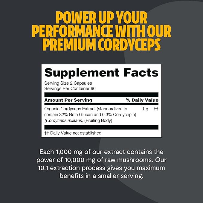 - NATURAL ENERGY SUPPORT - Premium cordyceps mushroom capsules contain a powerful organic blend of water-extracted Cordyceps for enhanced vitality. Our cordyceps extract delivers 10,000mg raw mushroom equivalent per serving for maximum potency.