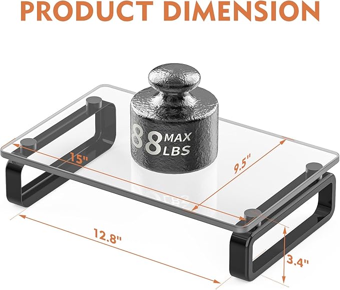 - Personality Design ☞ Our Design team spent a lot of time on this computer monitor stand riser design. The riser top is made of clear tempered glass with round polished edges, not only safe for human body but also looks elegant