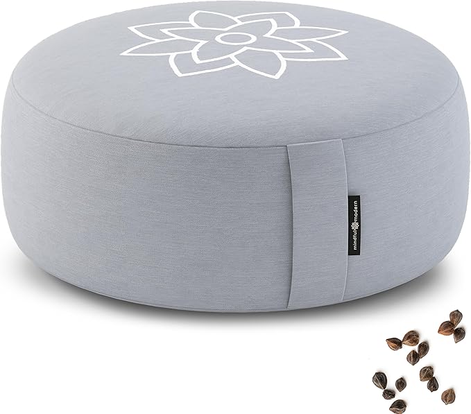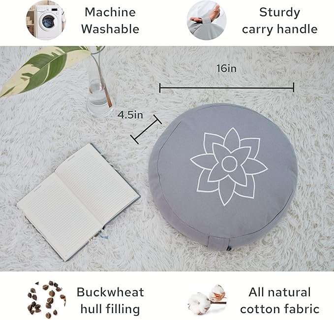 - NATURAL AND SUSTAINABLE MATERIALS - Our 16'' x 4.5'' floor bolster is filled with 100% natural buckwheat hulls and then covered with organic cotton. The cover on our yoga seat has a subtle zipper, allowing you to adjust the filling to your desired comfort level. The stylish round shape has extra legroom for deep meditation.