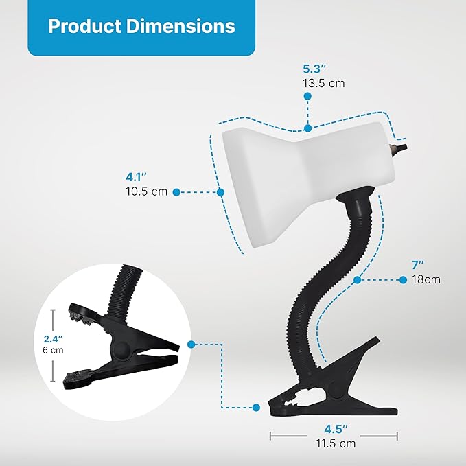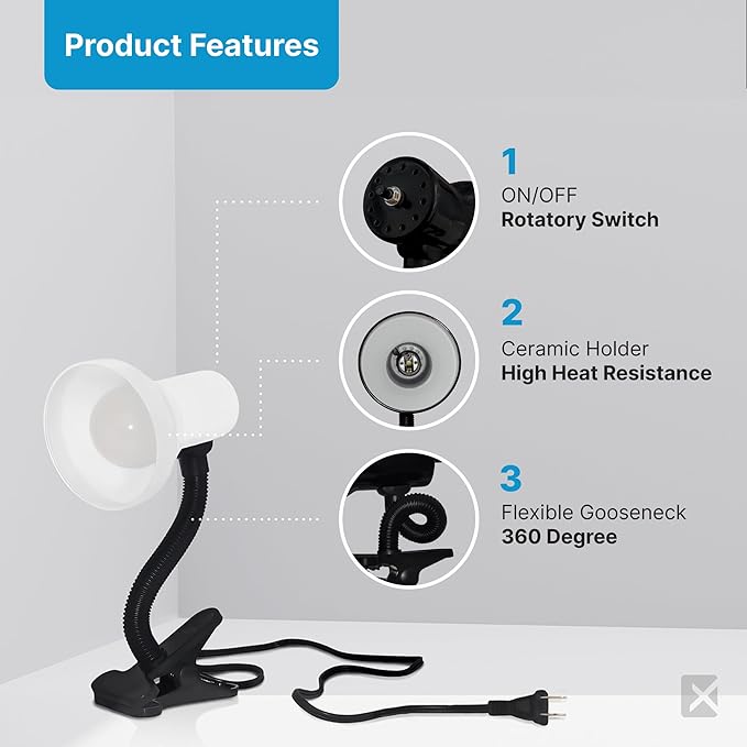 - Product Features: Clip on lamp with a 360° adjustable gooseneck provides flexible positioning for directional lighting; supports up to a 60-watt bulb; compatible with cfl light bulbs