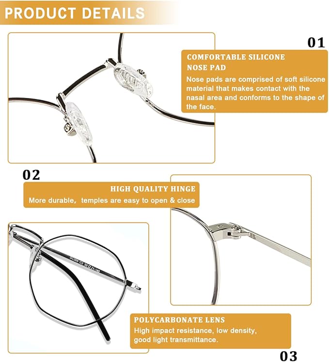 - 😊【Classic round frame 】 Our blue light glasses use classic retro round transparent lenses to see the world more clearly. Metal temples, with adjustable nose pads, are more comfortable and safe, and bring a more comfortable wearing experience to your eyes.