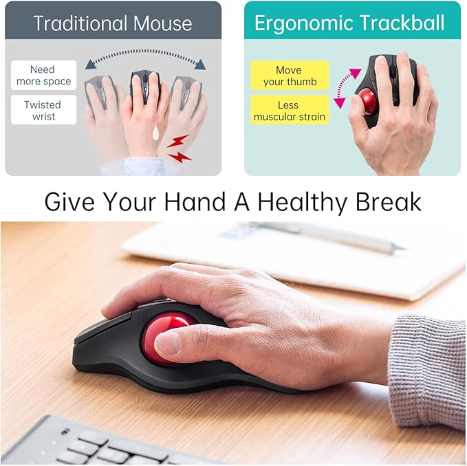 - 【SMOOTH & SNESITIVE TRACKBALL】- This rollerball mouse consists of a 40mm trackball, high-sensitive 3-dot positioning technology, and thumb control to move the cursor smoothly & accurately. Keep your wrist and mouse in one place, and reduce hand movement. A great solution for limited space, it works not only on flat surfaces but also on your leg, sofa, bed, carpet, etc.