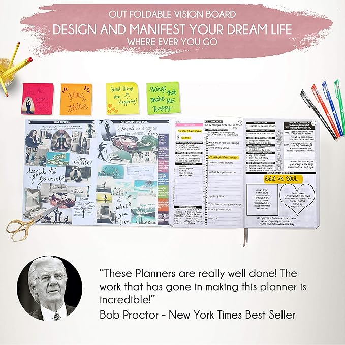- MANIFESTATION JOURNAL - This deluxe daily planner and gratitude journal for women comes in A5 size (5.8 x 8.3 inches). The life planner comprises 264 pages of thick 100 gsm paper, including 90 daily planning sheets, guiding you on how to become the best possible version of yourself on a mental, physical, and interpersonal level. It's a unique diary based on leading scientific studies proven to increase productivity and happiness. The journal features an out-foldable vision board to help you stay focused, morning and evening power questions, mind maps, reflection pages, habit trackers, a back pocket, and much more than any other planner on the market!