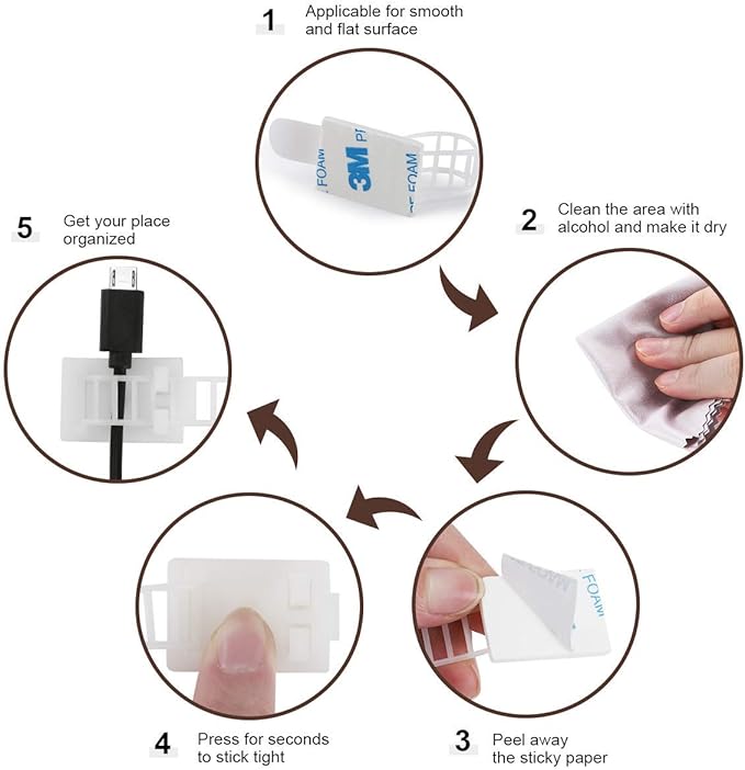 - 【WARM REMINDERS】- Please adhere the tape backing on even and flat surface when you use these adhesive cable clips, such as on desk, wood floor, tile wall, steel... Feel free to use since the self adhesive tape would never cause furniture damages or leave any residues. What’s more, we ensure 100% customer satisfaction with 60 day NO-QUESTION-ASKED money back guarantee