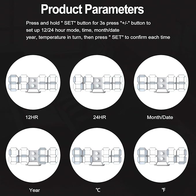 - Multi-function: Date, 12/24H time mode, temperature (℃ or ℉), looping display setting, snooze alarm, automatic brightness adjustment, hangable design suitable for Bedroom, Bedside, Desk, any low wall place close to you for setting.