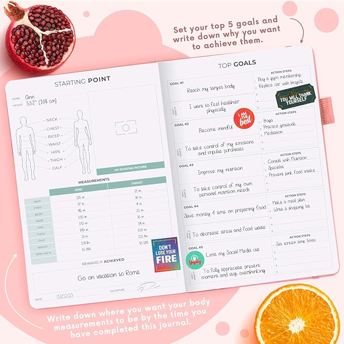 - MEDIUM FORMAT, STICKERS & USER GUIDE – This health and fitness tracker planner comes in A5 size (5.8x8.3”) and has an eco-leather hardcover, thick 120gsm paper, lay-flat binding, pen loop, elastic, 3 bookmarks, pocket for notes, stickers, and user guide.
