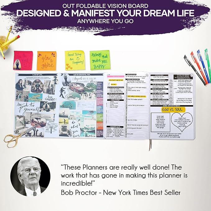 - MANIFESTATION JOURNAL - This deluxe daily planner and gratitude journal for women comes in A5 size (5.8 x 8.3 inches). The life planner comprises 264 pages of thick 100 gsm paper, including 90 daily planning sheets, guiding you on how to become the best possible version of yourself on a mental, physical, and interpersonal level. It's a unique diary based on leading scientific studies proven to increase productivity and happiness. The journal features an out-foldable vision board to help you stay focused, morning and evening power questions, mind maps, reflection pages, habit trackers, a back pocket, and much more than any other planner on the market!