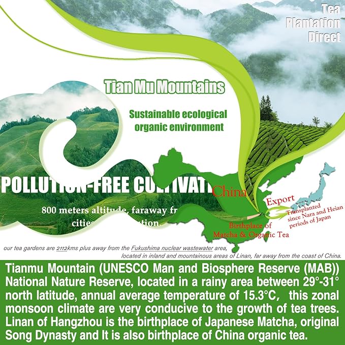 - ✔️Origin & Endosement - Culinary grade matcha is from Tianmu Mountains, the birthplace of Japanese matcha, original from Song Dynasty, China FIRST organic plantation, a national natural reserve, best climate and geography for tea growing, pollution free and radiation free.