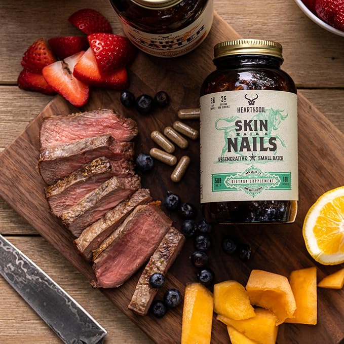 HEART & SOIL – 3000mg Skin, Hair and Nails Support Supplement with Grass Fed Beef Liver, Bone Marrow, Cartilage, Biotin, Collagen, Vitamins A, Riboflavin, Elastin – 180 Capsules