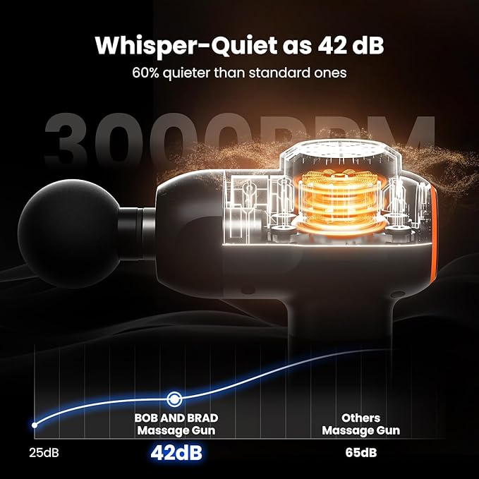 - Whisper Quiet & 10-Minute Auto Shut-off: Equipped with an intelligent chipset, the massage gun automatically shuts off after 10 minutes of use, preventing overuse and potential harm to the body. Utilizing advanced noise reduction technology, it operates at a whisper-quiet level as low as 40 decibels, quieter than most massage guns.