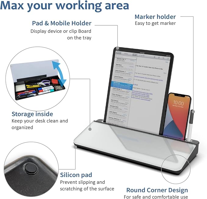 - Elevate Your Productivity - Transform your workspace with our Desktop Erase Board. It's the ideal tool for organizing your thoughts, brainstorming ideas, and prioritizing tasks - all within arm's reach.