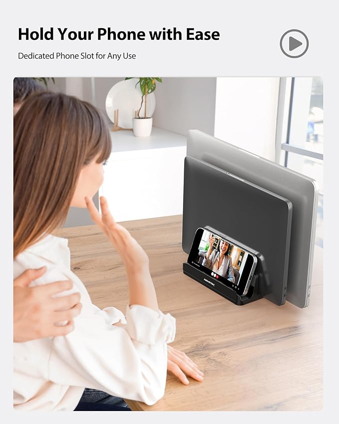 - Unmatched Stability: With a heavy-duty base and ultra-grip silicone mats, our vertical laptop stand keeps your devices upright and secure. Say goodbye to tipping, toppling, and dropping.