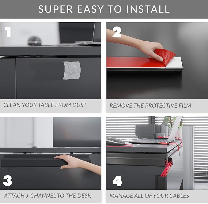 - GREAT FOR GLASS TABLES: We welcome you to the ultimate solution for desk wire management under glass tables. The Pro Office cable management J Channel can be installed horizontally or vertically without drilling any holes in your desk.