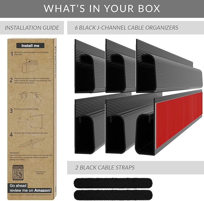 - WIRES ARE COMPLETELY HIDDEN: Your new cable management kit hides all messy wires from view, leaving behind a neat and tidy desk. The J Channel Raceway kit includes 6x 16” (41cm) black cable raceways, 2 straps, and 6 super strong mounting tapes – the perfect set for an office desk.