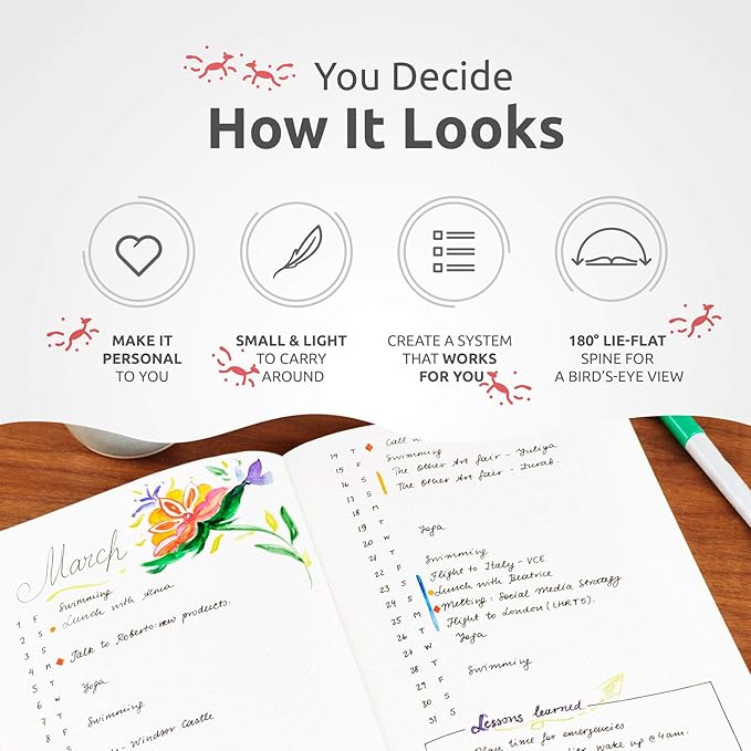 - 180° LAY-FLAT DOTTED GRID JOURNAL WITH A STAY OPEN DESIGN: get a bird’s-eye view of your notes as this unique dotted paper notebook lies completely flat to make bullet-journaling faster; designed with a perfectly aligned continuous grid across both sides of the page, ideal for sketching, organizing and journaling.