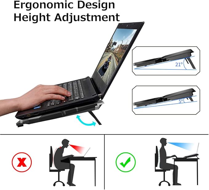 - 【Ergonomic Design & Non-Slip Baffle】Laptop cooling pad with ergonomic design is comfortable in all-day using. Laptop cooler stand can be hidden when you don’t use it. Two non-slip baffle can prevent your laptop following down on slanting surface. Also have enlarged and thickened anti-skid pad at the bottom keep laptop stable