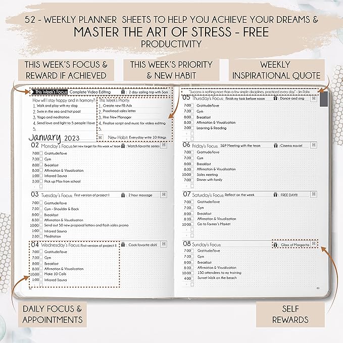 - INCREASE YOUR PRODUCTIVITY AND HAPPINESS BY 300% - Help you become much more productive by teaching you how to focus only on your top priorities and delegate the rest. So you can achieve more and create more free time, happiness for yourself. The perfect productivity and time management planner. This Weekly Planner includes To-Do Lists, Feel-Good Lists & Gratitude Journal - The weekly/monthly feel-good list will help you not to forget yourself and put yourself first.
