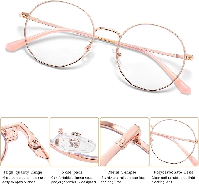 - 😊【Classic round frame 】 Our blue light glasses use classic retro round transparent lenses to see the world more clearly. Metal temples, with adjustable nose pads, are more comfortable and safe, and bring a more comfortable wearing experience to your eyes.