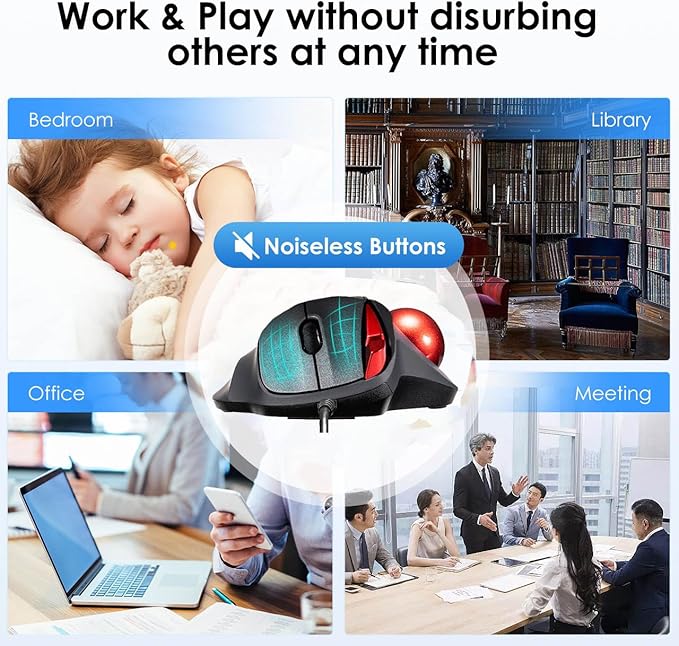 - 【Silent & DPI Adjustable】- This ball mouse wired supports precise cursor movement speed with 4 levels, ranging from low to high: 600/800/1200/1600. Suit different tasks, ensuring accuracy & speed. Press the middle DPI button to change it faster or slower. Features noiseless function on the left & right clicks. Suitable for PC operation in quiet places such as public places, libraries, meetings, or at night.
