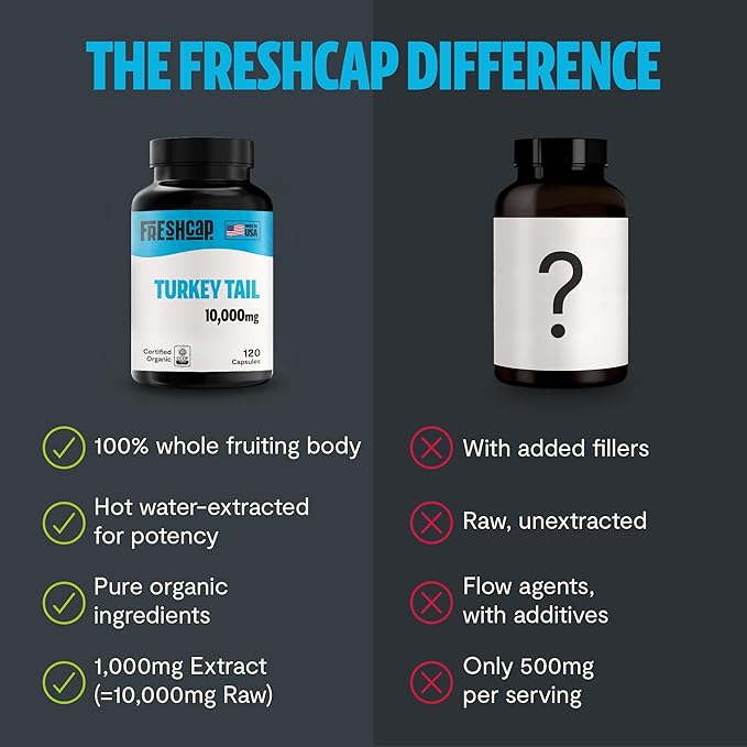 FreshCap Mushrooms Turkey Tail Mushroom Supplement 10,000mg – Organic, Turkey Tail Extract for Immune Support Supplement, Mushroom Supplement Capsules, Ayurveda Immunity Supplement (120 Capsules)