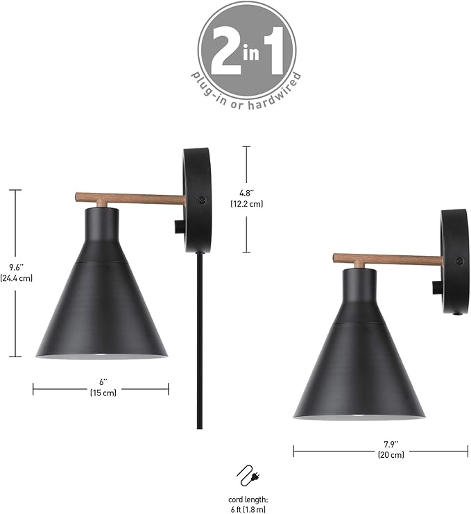 - PLUG-IN OR HARDWIRE CAPABILITY: the innovative 2-in-1 design allows you to install your wall light as a plug-in so you can place it anywhere in your home or use the hardwire option to create a sleek cordless look