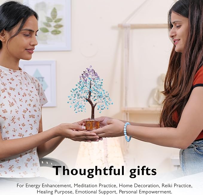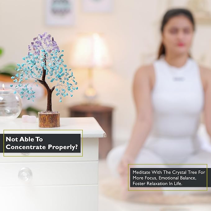 - Crystal tree specification: Turquoise and amethyst tree figurine made from the beautiful small crystal beads of amethyst and turquoise stones and crystals and silver wire with the approximate size 10-12 Inch which look beautiful when use in home, office, living room etc. The crystal décor tree is crafted by the skilled artisans in INDIA who gave a beautiful look to the feng shui tree.