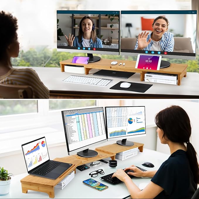 Nnewvante Monitor Stand Riser, 60 inch Large Bamboo Dual Monitor Stand for Desk, 3 Shelves Desktop Screen Riser with Adjustable Length Angle for Computer Laptop PC