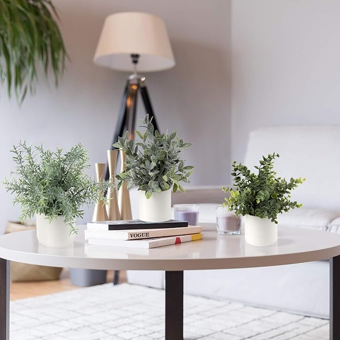 - Package and Dimensions --- Comes with 3 types of potted plants(eucalyptus, rosemary, boxwood), each ceramic plant pot is 3.3" in diameter and 3.3" in height. While the artificial plant measures approximately 7.5" tall from the bottom to the top of the plant.