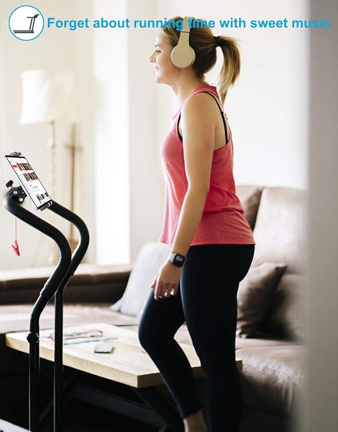 - 【Perfect Fitness Partner】 Treadmill tablet mount works as a good partner for your tablet on various occasions, ideal for watching fitness instruction video or TV show, convenient for listening music while exercising, great for following sports channels on your tablet while exercising on a treadmill or gym training. ( Not suitable for outdoor riding )