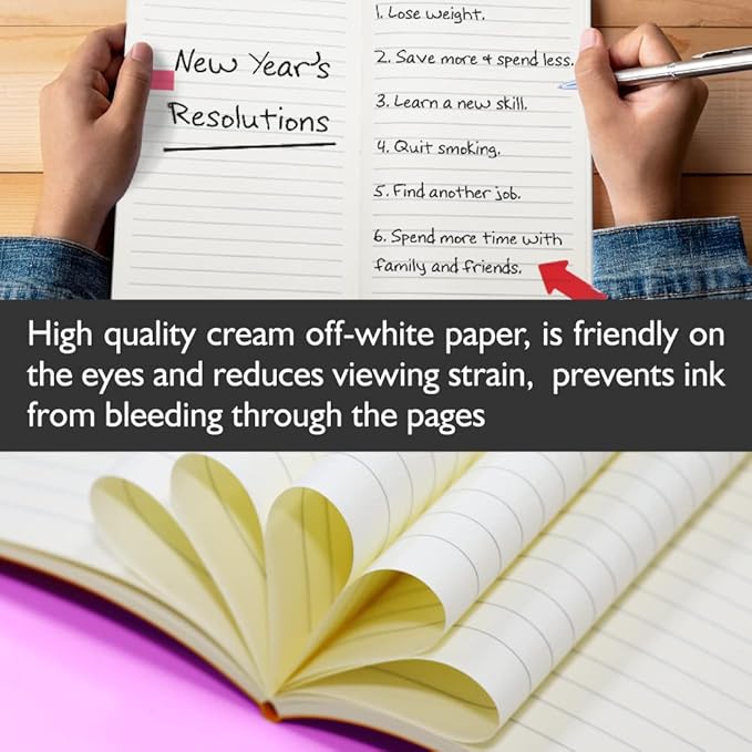 - 【Premium Quality】---64sheets/128 pages Line Acid-free paper, eco-friendly.8mm Wide Ruled Paper line,180°lay-flat design,smooth surface,perfect to write in.The thick paper of the composition notebook avoids ink bleeding through and feathering, suitable for most pen types. Strong Binding keeps the pages and cover together!