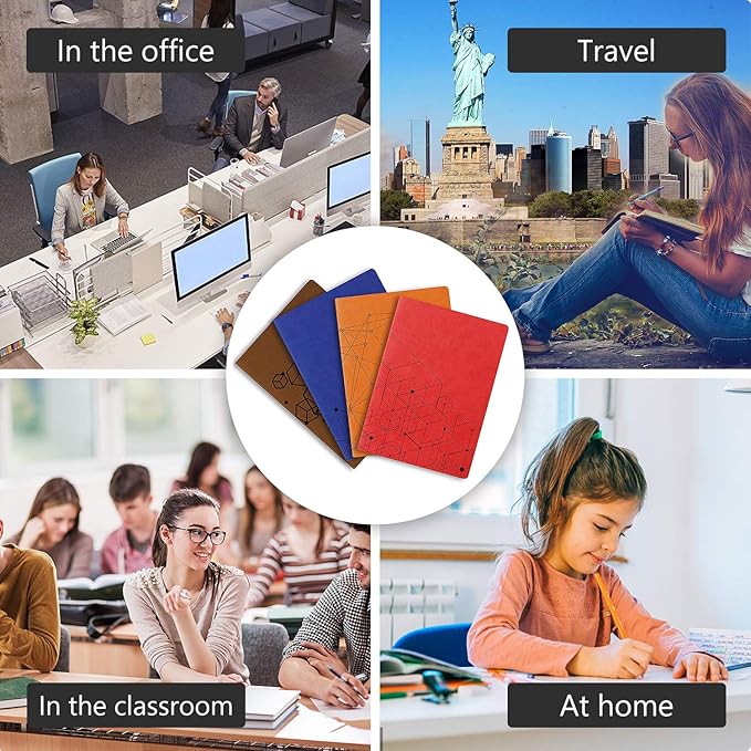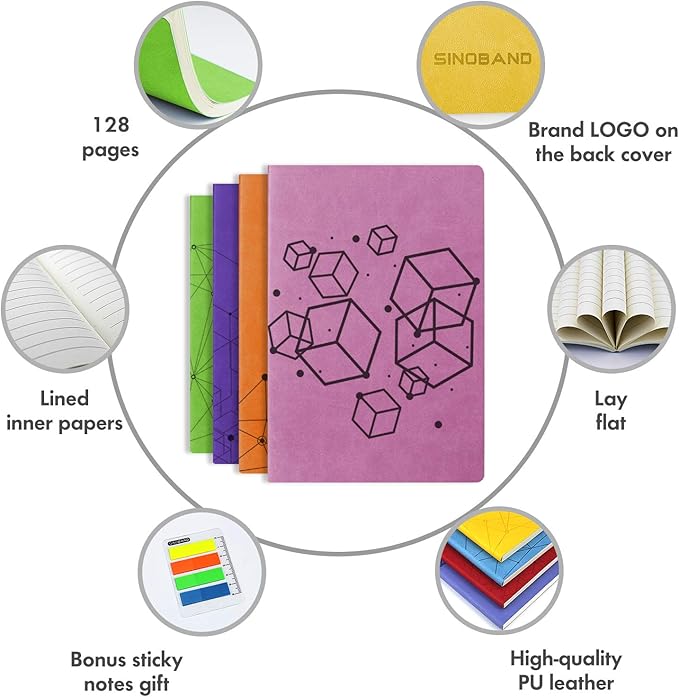SINOBAND 4 Pack Notebooks for journaling,Colorful Subject Notebooks Set with Geometric Graphics Pattern,PU Leather Notebook writing journals with lined paper for School and Office(Random Colors)