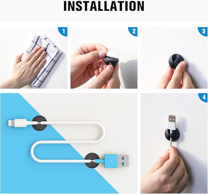 - Easy to install: Remove the protective film, stick the cord organizer, and drain the air from the contact surface. Suitable for a variety of smooth surfaces, like tiles, steel, glass, mirrors, painted wood