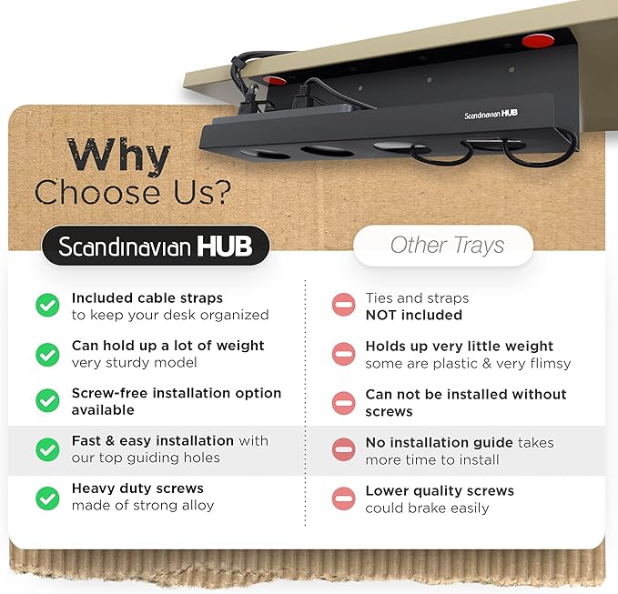 - Join more than 100,000 satisfied customers who have already untangled their cable mess with Scandinavian Hub cable trays. Our under table cable management kit is made out of carbon steel, giving it sturdy construction and is the Strongest Kit on Amazon. This full sheet under desk wire organizer is powder coated for long life.
