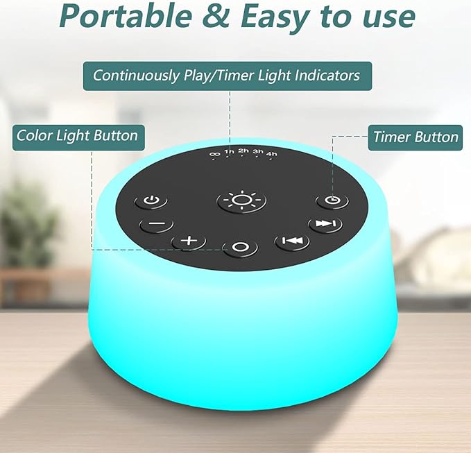 - ♪【Lightweight, Compact and Easy to use】 The design of the device is simple and intuitive, light and easy to carry, and the design of large enough buttons allows you to easily change the track, turn on/off the night light, change the color of the ambient light, and even set the timer setting within a few seconds.