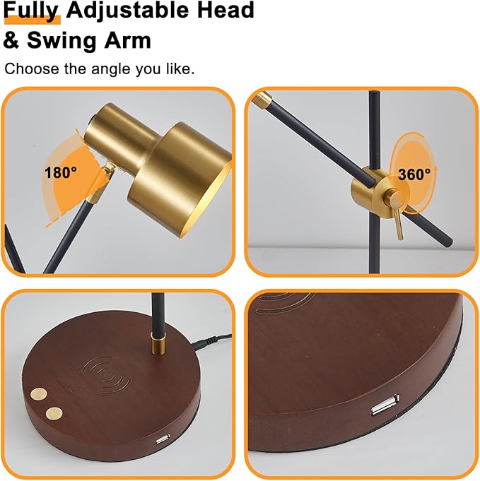- Unique Design: The base of the wireless lamp is made of solid wood, and the lampshade and arm of the USB table lamp are integrated with the solid metal lampshade. USB LED lamp has both modern functions and retro style, easy to wipe and durable