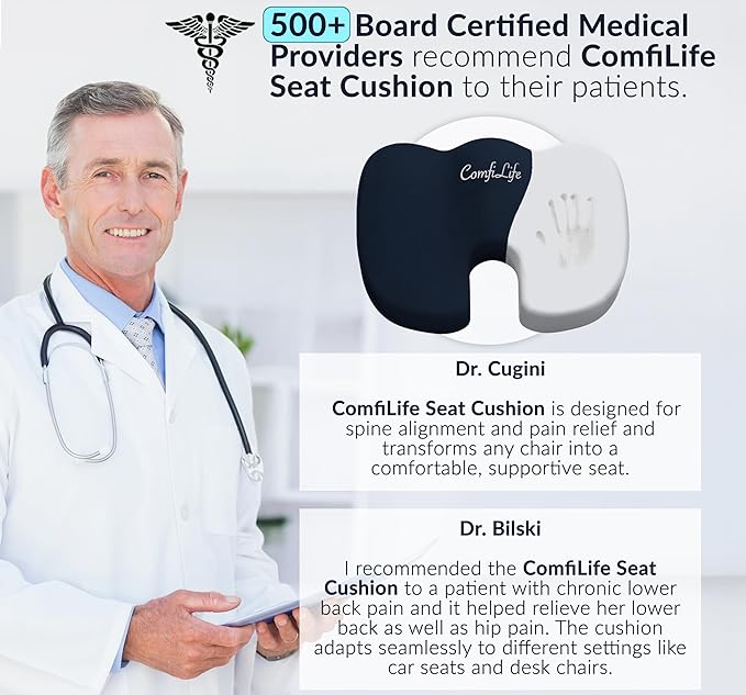 - For Office Chair, Driving and Traveling - Provides comfort on most hard surfaces; office chair, desk chair, kitchen, car seat, airplane, rocking chairs and wheelchairs, office use, truck drivers, frequent travelers, sporting events and pregnancy. ComfiLife Seat Cushion may not fit perfectly some contoured car seats and large chairs. ComfiLife Coccyx Cushion will provide less support with increasing weight. For optimal support recommended weight is up to 225 lbs