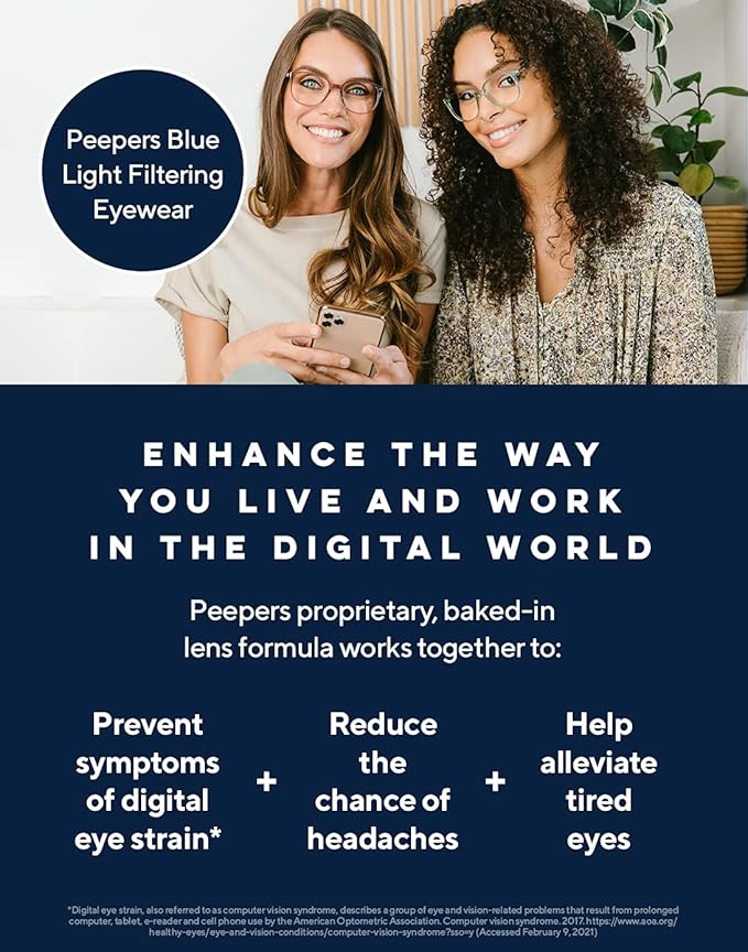 - PEEPERS BLUE LIGHT FOCUS LENSES - Utilize proprietary baked-in technology that filters over 40%+ of High-Energy (HEV) Blue Light from digital devices and other potentially harmful sources reducing eye strain and making screen time easier on the eyes