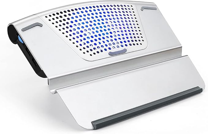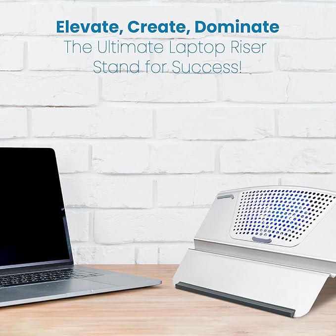 - Secure Computer Stand: Crafted for stability, our laptop stand features non-slip padding to securely cradle your laptop. Innovative integrated cooling fans maintain optimal ventilation, safeguarding your device and enhancing your work experience.