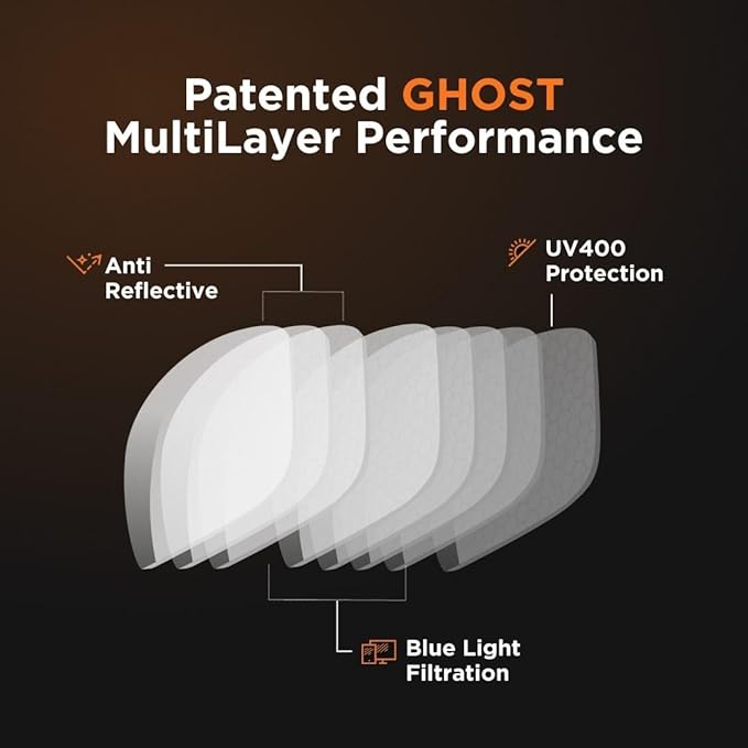 - 👻 Patented GHOST Technology (Clear): Blue light blocking glasses. Filters 100% of blue light from 380 to 400nm // 60% across the spectrum [380nm to 450nm]. Provides 100% UV protection.